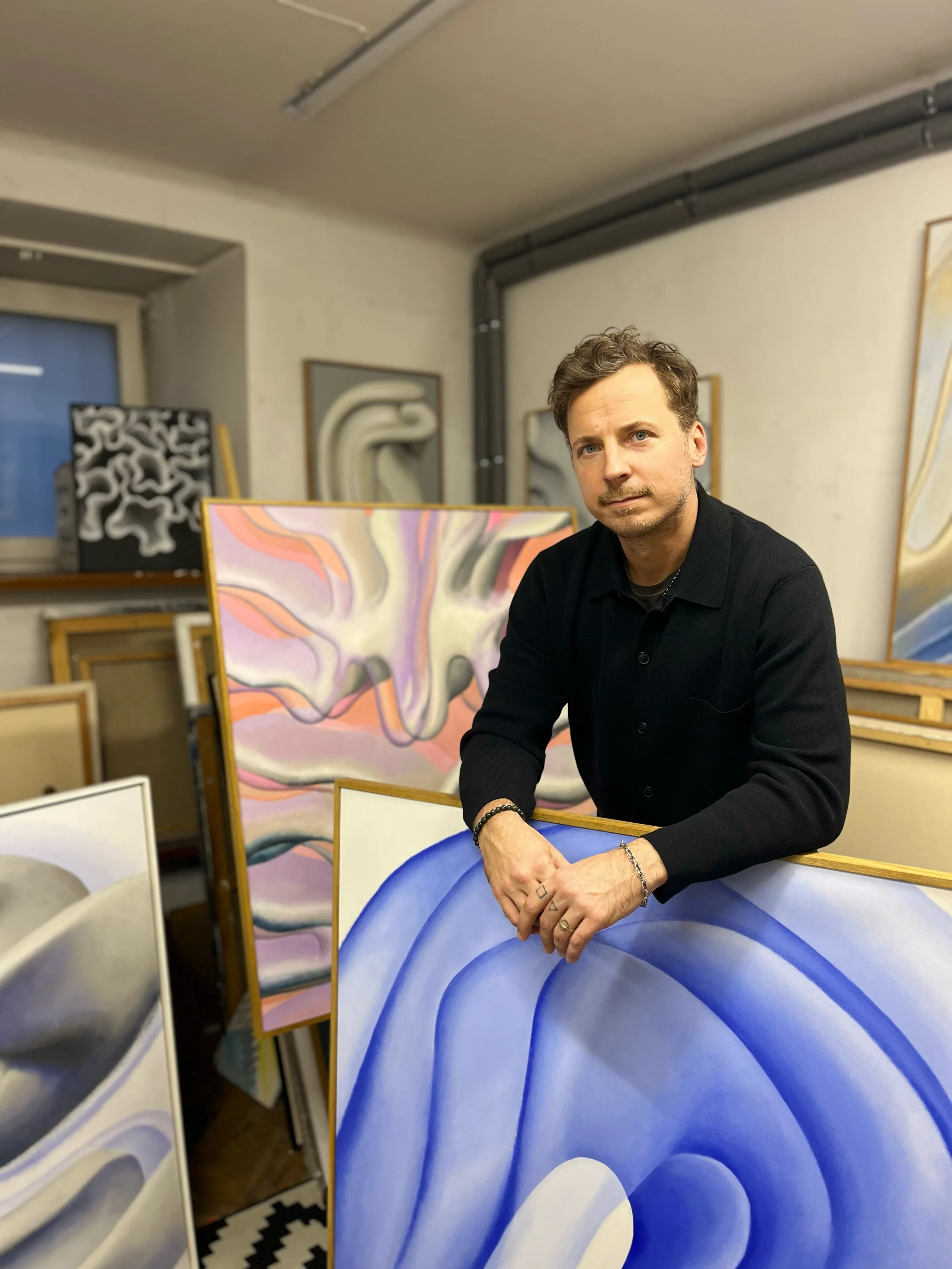 He creates an abstract, organic world in his paintings using acrylic paints.